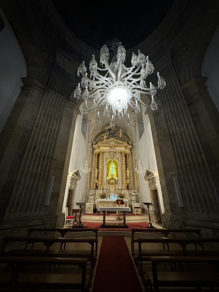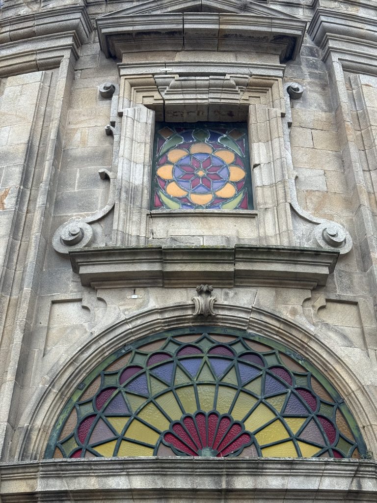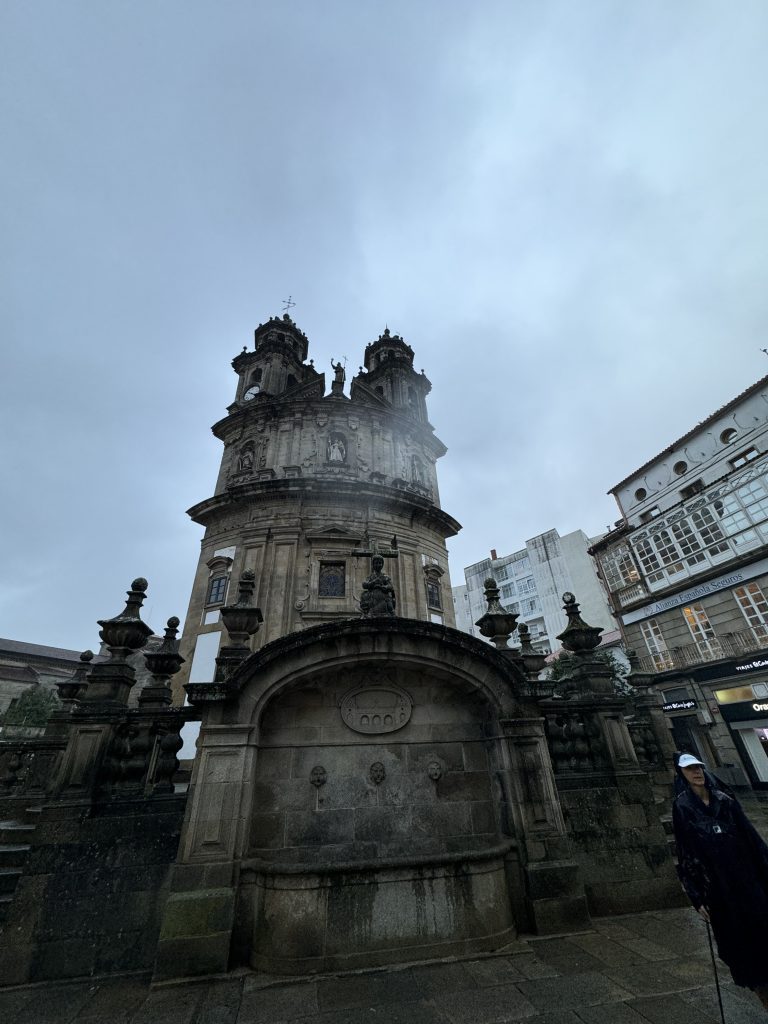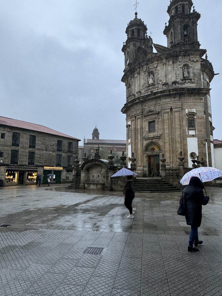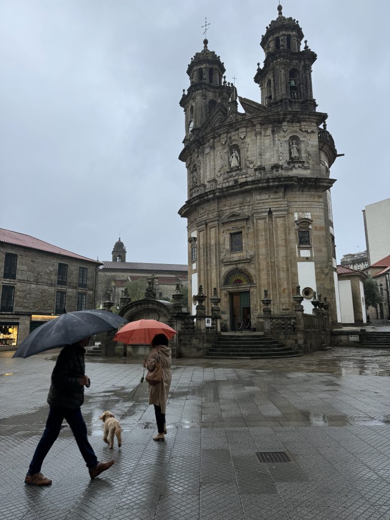 It’s dark here at 8:00 am. The sun rises around 8:30. We usually leave around 9:00 am, but with the rain, everything was muted. We left town by way of the Cathedral, which was a still vision. The rose window has a scalloped shell, the sign of the Camino.