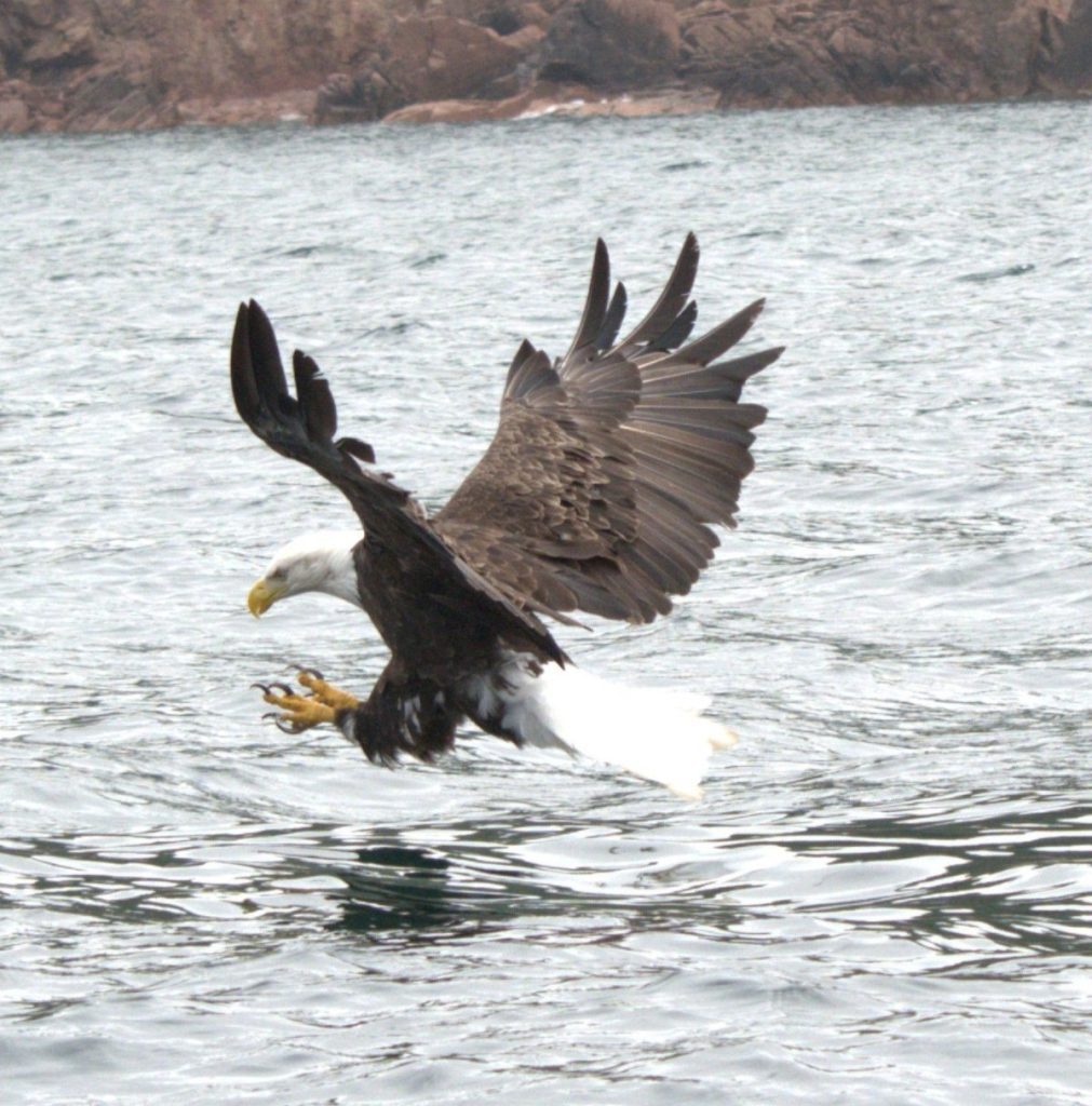 Circumnavigating both islands, we saw many more bald eagles, plus great black-backed gulls, herring gulls, black-legged kittiwakes, razorbills, black guillemots, double-crested cormorants, great cormorants, bank swallows, great blue herons, and a dozen or more grey seals.