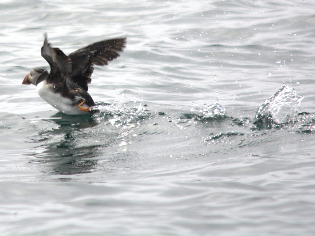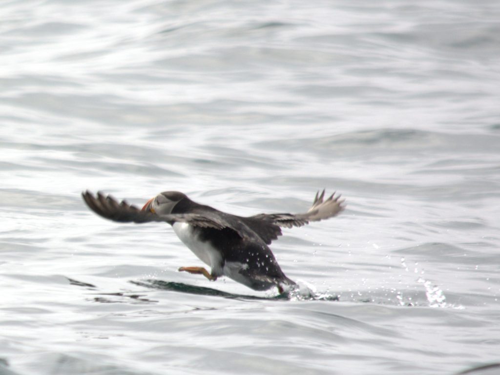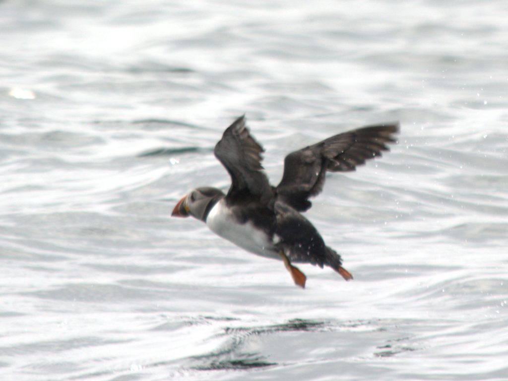 At first the puffins were difficult to distinguish from the razorbills, whether bobbing on the sea or swooping through the air. Between the boat rocking and all the birds flying and dark plumage against the rolling seas and gray skies, it was a tough job to snap a few decent shots.