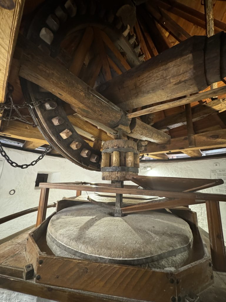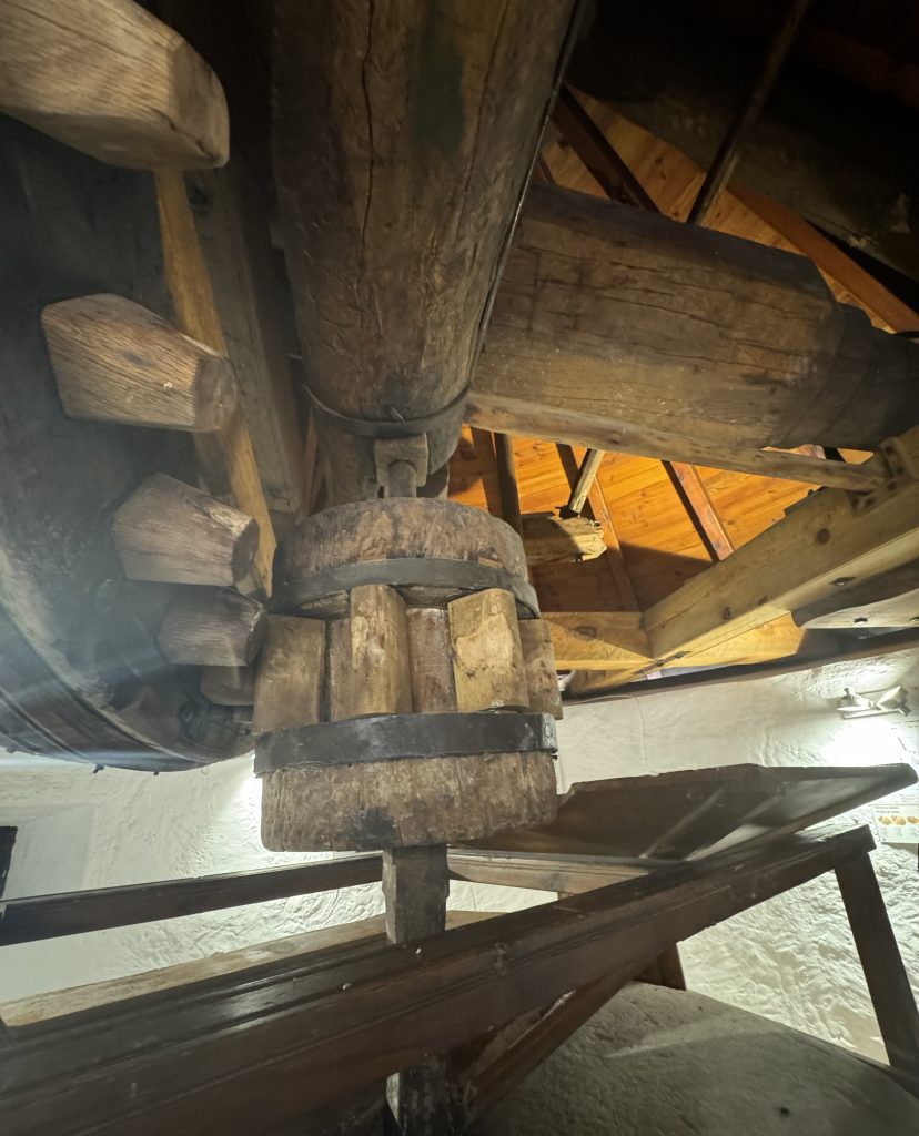 On the upper portion are seven named windmills that follow the story of Don Quixote. We received an explanation of each, prerecorded in English. We entered two windmills: one to learn mechanical functionality; the other more of a living space with small windows on the world.