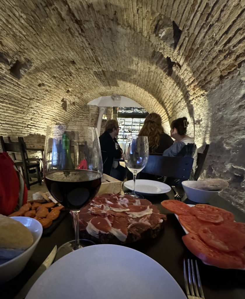 We’d reserved a table at a traditional restaurant famed for Iberian ham. Spanish food has become familiar but this jamón was a cut above and served in a unique setting. There were three servings of meats, fresh tomatoes, Manchego cheese, and hearty bread and crackers.