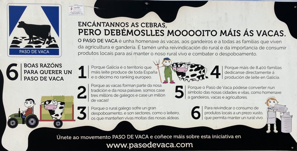 Since Negreira, we continue to see signs that dairy is important to this area. Today we saw our first Holstein herd. The herds we’ve seen are small; a dozen, maybe two, the vast majority are beefers. In town we found heartwarming dairy cows on display.