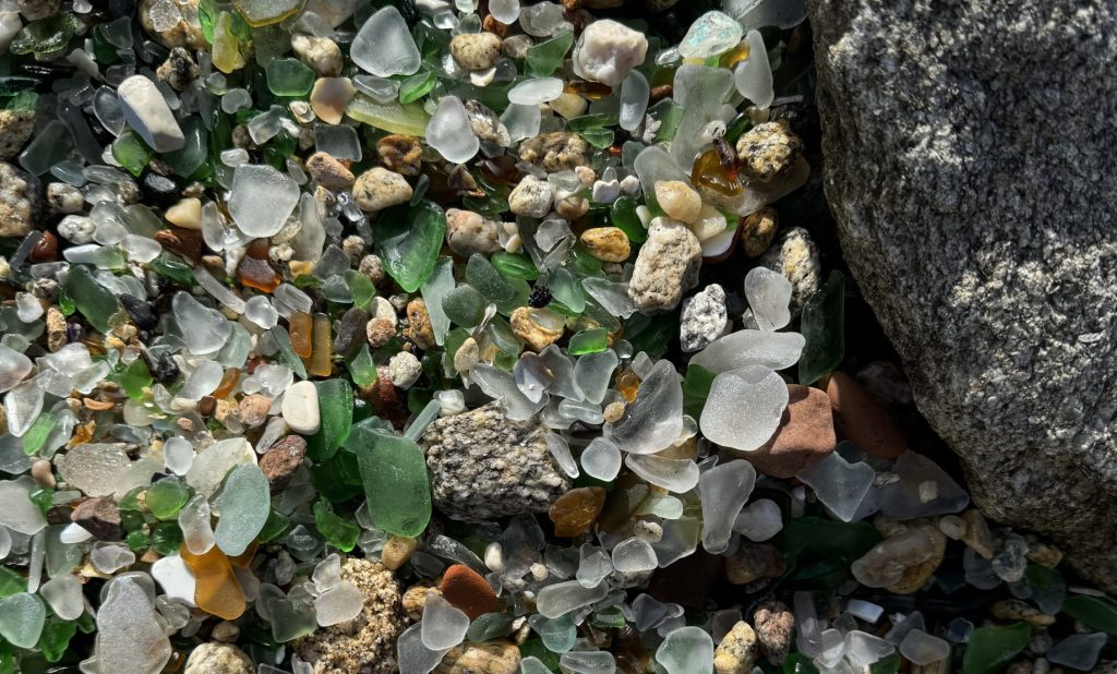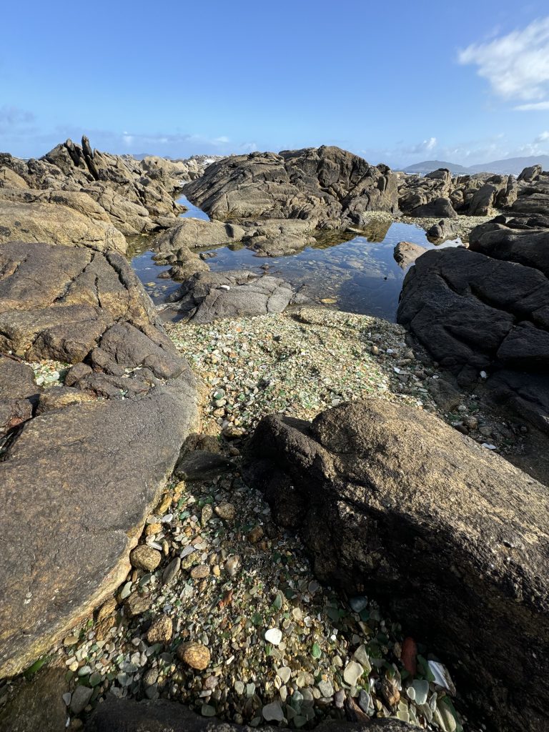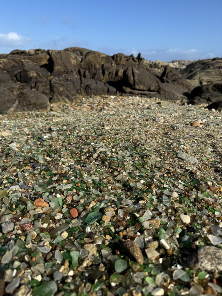 We stashed our packs at the hotel desk and took a cab back to the sea glass beach. There’s a hip cafe at the restored lighthouse. The kitchen was closed so we settled for scrumptious olives and fresh croissant in view of the sea.