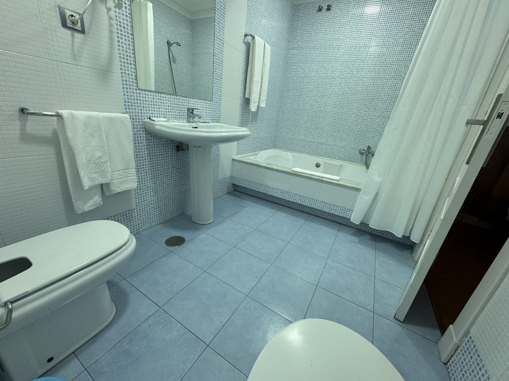 In the bathroom, also larger than typical for Europe, was the expected sink, toilet, and bidet, surrounded by ceramic tile, in good repair but dated. Plus one massive a tub. That was a nice surprise!