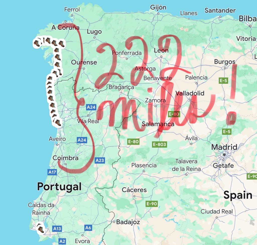 A few months ago, we fine-tuned and finalized plans. There are many possible routes. Ours is the Camino Portugues. We’ll trek from Porto, Portugual, to Santiago de Compostela, Spain, then on to Finisterre. Two hundred twenty-two miles, plus whatever detours the day brings.
